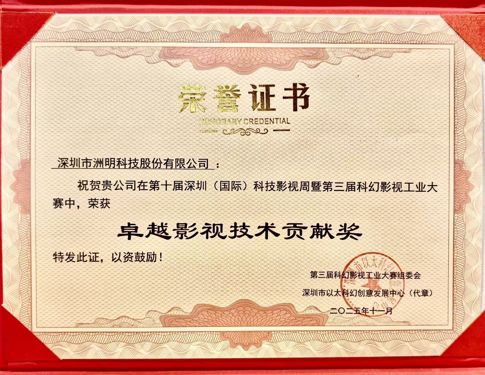 在此次盛会上,深圳市洲明科技股份有限公司凭借在科幻电影《外星异客》XR虚拟制作中的技术实践与创新应用,荣获组委会颁发的“卓越影视技术贡献奖”。在该项目中,洲明团队参与了虚拟拍摄从前期规划到现场执行的全过程,构建了明代外星观测站、深海外星古城等核心场景,并以LED巨幕结合XR技术完成高品质视觉呈现。