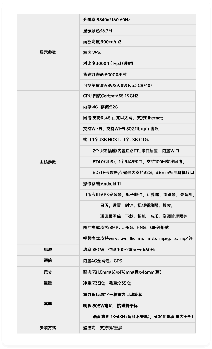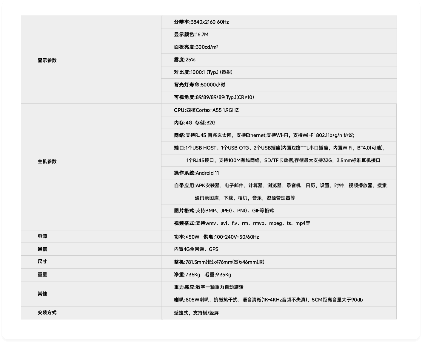 支持远程遥控器、时间校正、设备锁、系统升级、屏参设置、甩一甩、清空节目、开关屏,定时开关机。